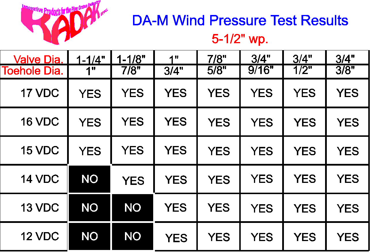 The above test results where made with a regulated power supply and measured with a digital volt meter. Every attempt was made to insure correct wind pressures and voltages. The actions used for this test did not receive any special adjustments other then action frame adjustment for pallet thickness. They where randomly taken from stock for this test. Customers should not expect all Direct-Action magnets to perform 100% of values stated in chart. A reasonable amount of voltage and wind pressure headroom should be used when selecting a Direct-Action magnet. These results are only to provide information from our testing and do not represent any guarantee of performance. Testing was not performed on wind pressures higher then 11-1/2" wind pressure. Some users have reported success with pressures up to 17" wind pressure with 3/4" pallet valves. These higher pressures may require sensitive adjustments to spring rates and armature to pole adjustments. |