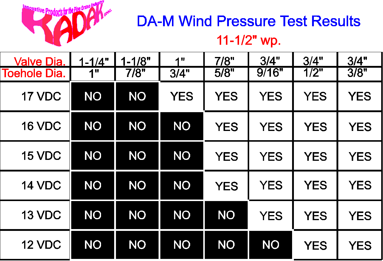 Testing was not performed on wind pressures higher then 11-1/2" wind pressure. Some users have reported success with pressures up to 17" wind pressure with 3/4" pallet valves. These higher pressures may require sensitive adjustments to spring rates and armature to pole adjustments. |